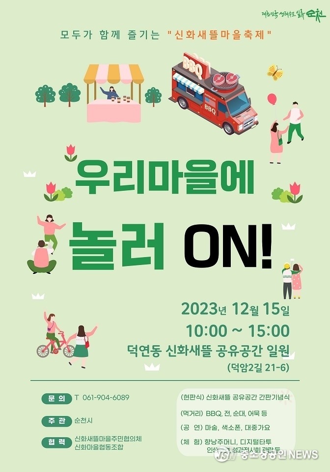 전남 순천시는 오는 15일 덕연동 신화새뜰공유공간(덕암동359-2) 일원에서 마을 축제인 우리동네에 놀러ON’ 행사를 개최한다고 밝혔다.