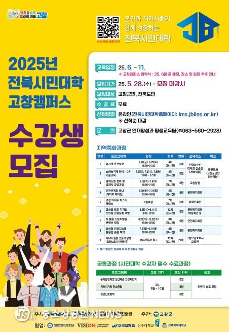 수강생은 온라인 전북시민대학 누리집에서 선착순으로 접수받으며, 도내 7개 대학교 캠퍼스와 협약을 통해 고창군 관내 학습장과 농수산대학교에서 6월부터 10월까지 총 11개 교육과정이 동시 운영된다.