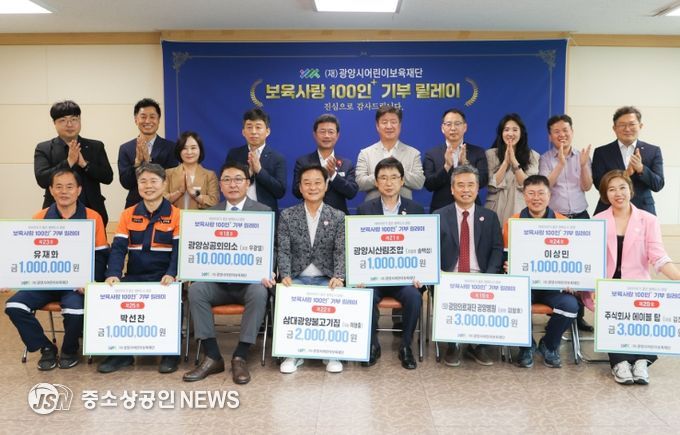 (재)광양시어린이보육재단은 지난 6월 12일 광양시청 만남실에서 정인화 시장, 이광용 재단 이사장, 김희영 상임이사, 기탁자 등 20여 명이 참석한 가운데 '보육사랑 100인+ 기부 릴레이' 기탁식을 개최했다고 16일 밝혔다.