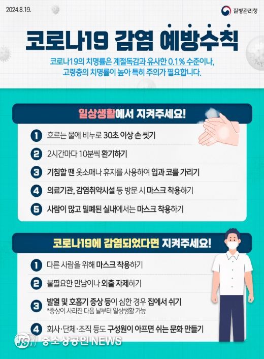 질병관리청은 병원급 의료기관의 주간 코로나19 입원환자 수가 8주째 증가하고 있어, 아직까지 여름철 코로나19 확산세가 지속되고 있는 것으로 판단하고, 어르신, 면역저하자 등 고위험군은 사람이 많은 곳 방문을 자제하고 마스크 착용 등 예방수칙을 잘 지켜달라고 당부했다.