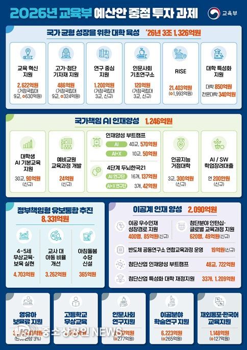 교육부는 8월 29일, 새 정부 국정과제 추진을 위한 2026년 예산안 106조 2,663억원을 편성했다고 밝혔다.