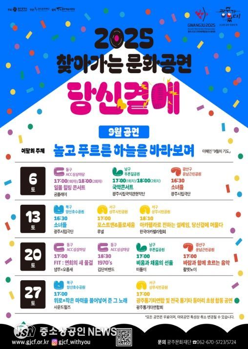 ‘찾아가는 문화공연’은 9월부터 11월까지 매주 첫째·셋째주 토요일 동구 국립아시아문화전당(ACC) 상상마당, 남구 푸른길공원, 광산구 운남근린공원에서, 둘째·넷째 주 토요일 서구 상무시민공원, 북구 양산호수공원에서 총 31회 공연을 진행한다.