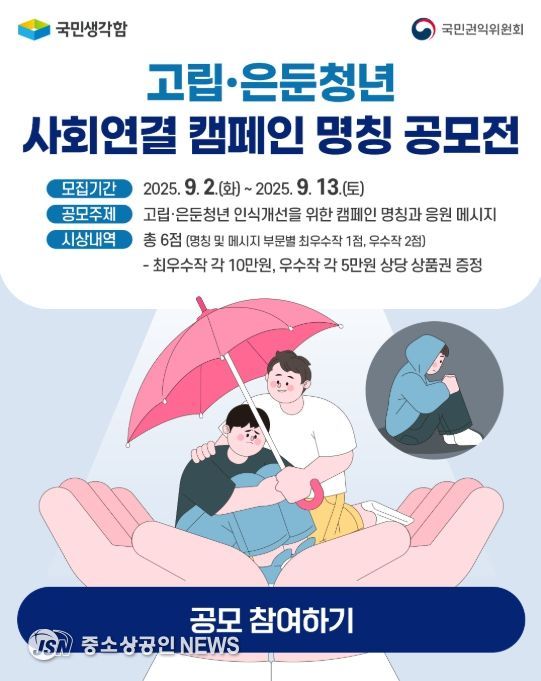 이번 공모전은 고립·은둔청년에 대한 사회적 편견을 해소하고 그들에게 용기와 희망을 주기 위해 마련됐다. 공모 기간은 9월 2일부터 9월 13일까지이며, 국민권익위가 운영하는 정책소통 플랫폼인 국민생각함을 통해 국민 누구나 참여할 수 있다.
