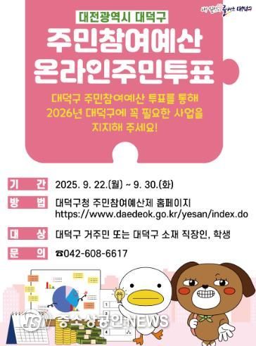 대전 대덕구는 오는 22~30일 2026년 주민참여예산 사업 선정을 위한 온라인 주민투표를 진행한다고 16일 밝혔다.
