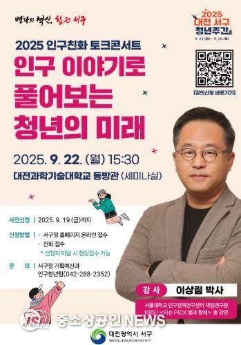서철모 청장은 “이번 강연은 청년들이 인구 문제를 자신의 삶과 연결해 고민해 볼 기회를 제공할 것”이라며 “서구는 앞으로도 청년과의 소통을 강화하고, 청년의 목소리를 정책에 적극 반영해 인구 문제를 함께 해결해 나가겠다”고 말했다.