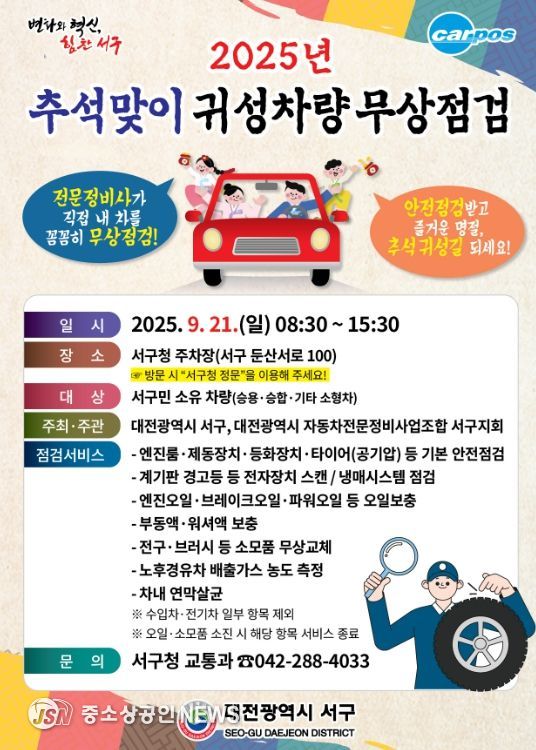 대전 서구는 다가오는 추석을 맞아 구민들의 안전한 귀성길 운행을 위해, 오는 21일 서구청 옥외주차장에서 자동차 무상점검을 추진한다고 17일 전했다.