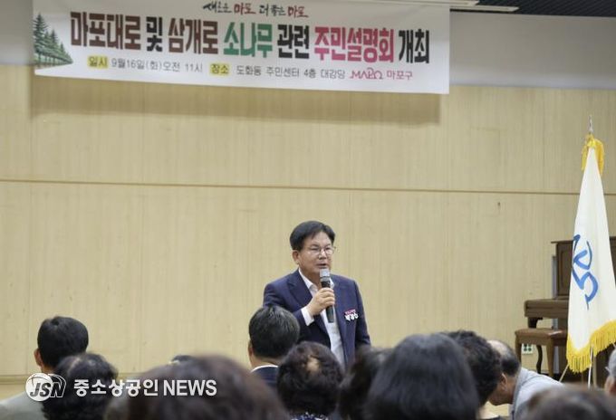 마포구는 9월 16일 오전 11시, 도화동 주민센터 4층 대강당에서 도화동을 포함한 인근 주민 100여 명이 참석한 가운데 ‘마포대로 및 삼개로 소나무 관련 주민설명회’를 개최했다.
