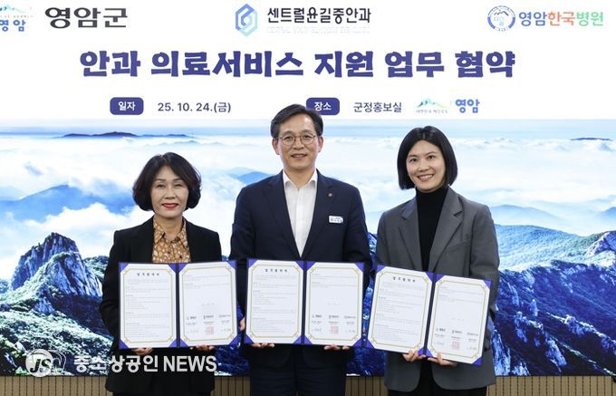 영암군이 24일 군청에서 센트럴윤길중안과, 영암한국병원과 ‘백내장 수술 지원 민관 협약식’을 체결했다.