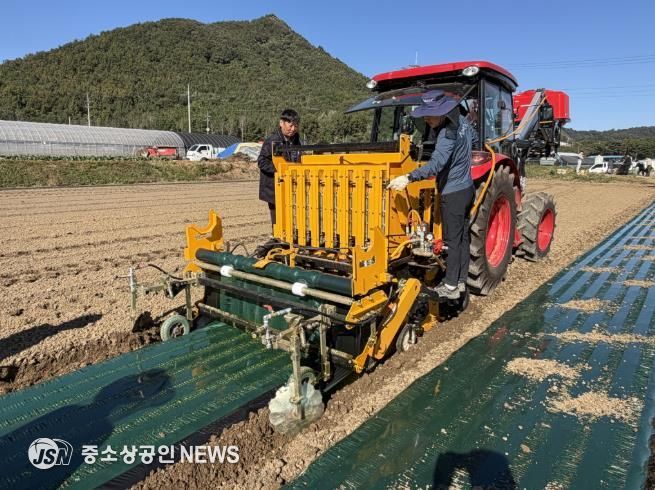 이날 연시회에서는 두둑 형성, 비닐멀칭, 파종, 농약 살포가 한 번에 가능한 마늘 복합파종기가 시연됐다.