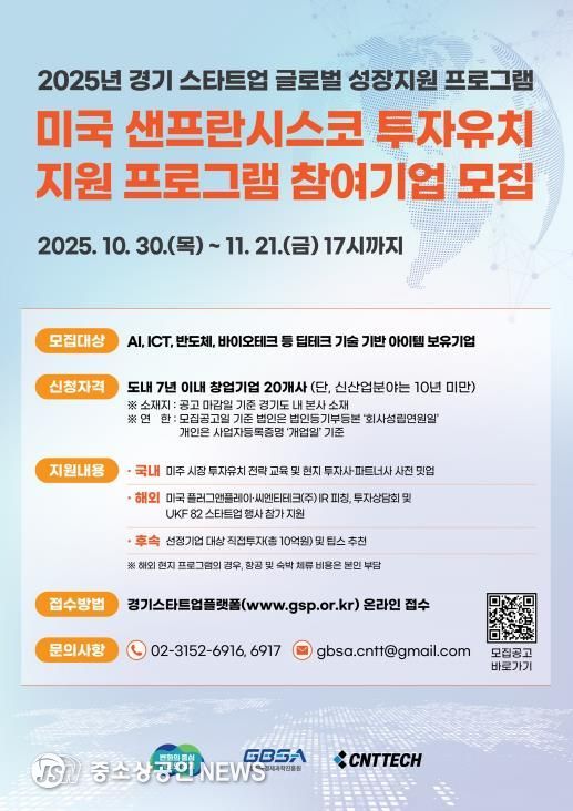 경기도와 경기도경제과학진흥원은 ‘2025년 경기 스타트업 글로벌 성장지원 샌프란시스코 투자유치 지원 프로그램’에 참여할 기업을 오는 21일까지 모집한다.