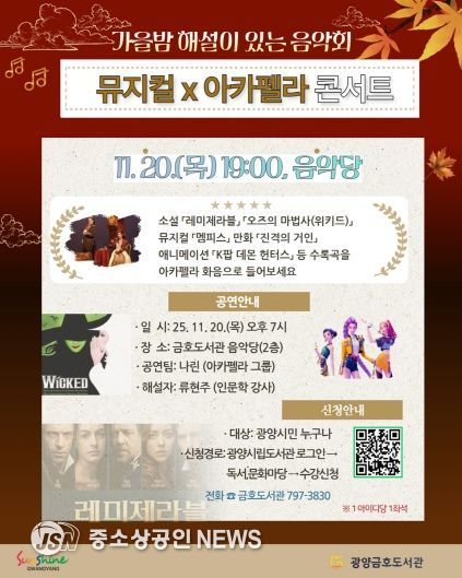 이번 음악회의 제목은 ‘뮤지컬×아카펠라 콘서트’로, 금호도서관이 새롭게 운영 중인 하반기 프로그램과 연계해 책과 원작 콘텐츠 속 뮤지컬 명곡을 아카펠라로 재해석해 선보인다.