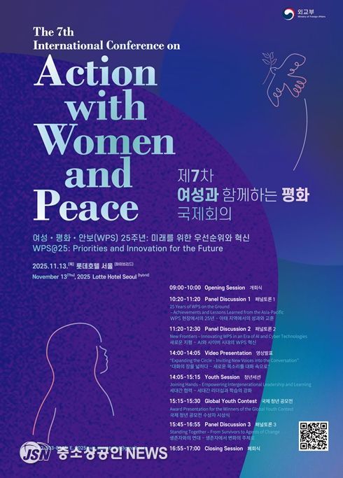 외교부는 11월 13일 롯데호텔 서울에서 제7차 '여성과 함께하는 평화' 국제회의를 개최한다. 이번 국제회의는 유엔 여성ㆍ평화ㆍ안보(Women, Peace and Security, WPS) 의제 논의 25주년을 맞아 WPS 의제의 “미래를 위한 우선순위와 혁신”이라는 주제로 개최된다.