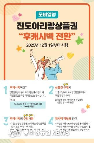 진도군 관계자는 “후캐시백(후적립) 방식은 군민들이 안전하고 편리하게 지역상품권을 사용할 수 있도록 돕는 동시에, 지역 경제에도 힘이 되는 제도다”라며, “앞으로도 군민들이 불편함 없이 혜택을 누릴 수 있도록 안내와 홍보를 강화하겠다”라고 말했다.