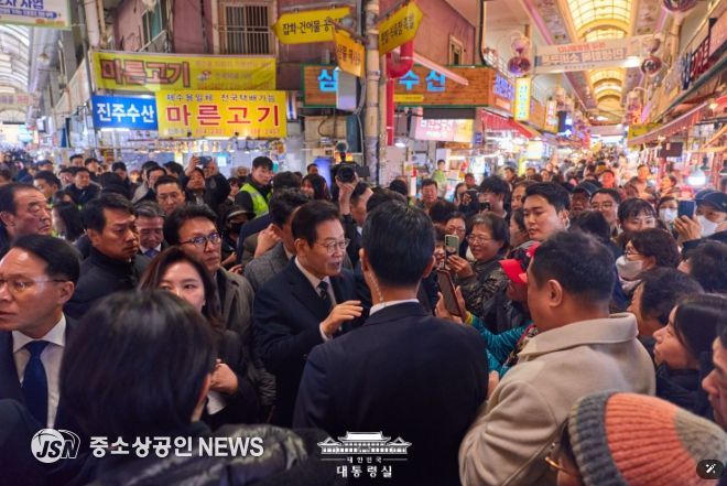 상인들은 “부산 경기가 어려운데 잘 살게 해 달라”, “부산에 와주셔서 감사하다”며 이 대통령의 손을 맞잡았다.
