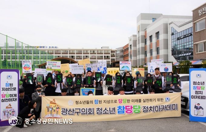 광산구의회가 25일 ‘청소년 참당당 정치 아카데미’ 3회차 프로그램으로 정광고등학교 학생 40여 명이 참여한 정책발굴 캠페인을 진행했다.