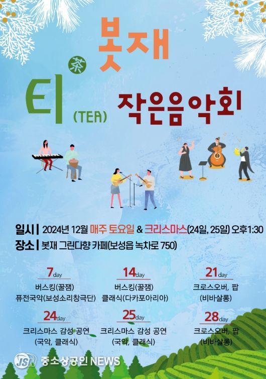 보성군은 봇재에서 연말을 맞아 12월 매주 토요일(7일, 14일, 21일, 28일)과 크리스마스(24일, 25일) 오후 1시 30분에 ‘봇재 티(TEA) 작은 음악회’를 개최한다고 밝혔다.