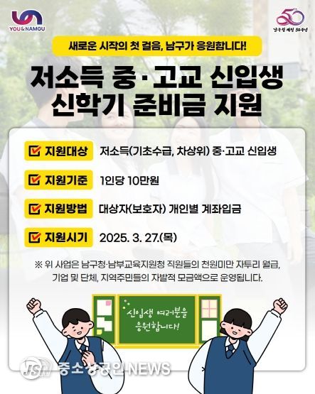 부산광역시 남구에서는 올해 저소득 중‧고교 신입생을 대상으로 신학기 준비금을 지원한다.