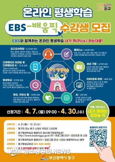 부산 동구는 지역 주민의 평생학습 기회를 확대하기 위해 한국교육방송공사(EBS)와 지난해 체결한 업무협약을 바탕으로 온라인 평생학습 플랫폼 ‘배움픽(Pick)’ 사업을 본격 추진한다고 28일 밝혔다.