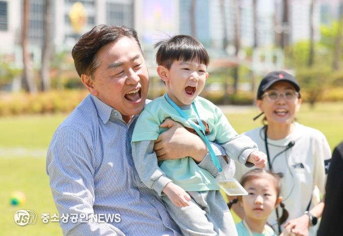 천년누리광장 잔디밭은 아이들의 웃음으로 가득했다. 달리기, 공굴리기, 터널 통과, 탱탱볼 놀이가 이어졌고, 김 지사는 아이들과 함께 뛰고, 공을 던지며 자연스럽게 그들의 놀이에 동참했다.