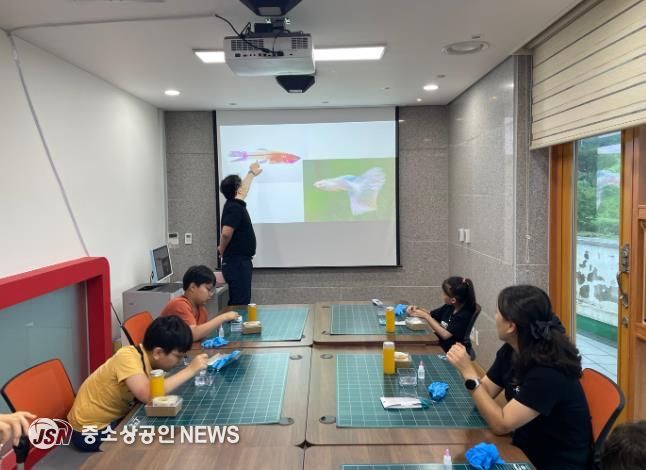 참가자들은 어류 표본을 선택해 투명 병에 담고, 식물성 글리세린을 주입한 뒤 병마개와 키링 고리를 결합하며 완성품을 제작했다.