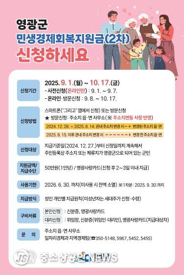 이번 2차분은 지난 1차와 동일한 기준으로 지급기준일인 2024년 12월 27일부터 신청일까지 계속해서 영광군에 주소를 둔 군민을 대상으로 하며, 지급기준일 이후 발생한 사망자, 전출자, 거주불명등록자, 말소자 등은 지급 제외대상이며 전액 ‘영광사랑카드’로 지급할 계획이다.