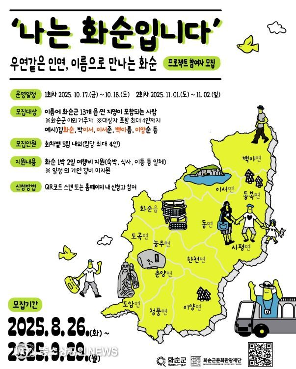 이번 프로젝트는 화순군 관외에 거주하며 화순읍, 능주면, 동복면, 도곡면, 동면, 이서면, 한천면, 백아면, 춘양면, 도암면, 청풍면, 사평면, 이양면 등 이름 속에 화순군 13개 읍·면 지명이 포함되는 사람(예: 이화순, 김이서, 이서준, 백아름, 이양순 등)을 대상으로 하여, 2025년 8월 26일부터 9월 29일까지 참여자를 모집한다.