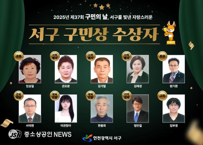 인천 서구는 제37회 구민의 날을 맞아 지역사회 발전과 구민 화합에 헌신한 2025년 구민상 수상자 10명을 선정했다고 2일 밝혔다.