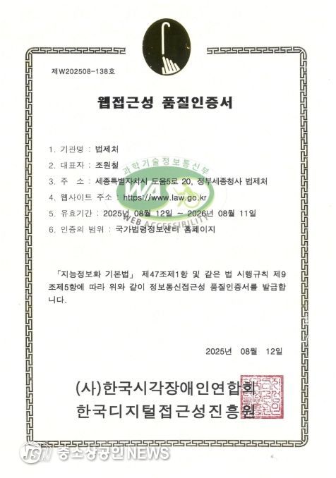 법제처는 9월 3일, 국가법령정보센터가 2년 연속 웹과 모바일 앱 모두 접근성 품질인증을 획득했다고 밝혔다. 2024년에 처음으로 웹과 모바일 앱 모두 인증을 획득한 데 이어, 올해도 정보취약계층의 접근성이 우수하다는 점을 다시 한 번 확인받은 것이다.