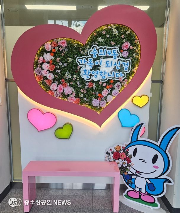 포토 존은 하트 모양의 패널에 엘이디(LED) 조명이 어우러진 디자인으로, ‘숭의4동 가족이 되신 걸 환영합니다’라는 문구와 꽃장식이 함께 배치돼 따뜻하고 깔끔한 분위기를 자아낸다.