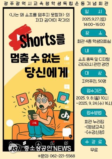 강연은 ‘나는 왜 쇼츠를 멈추지 못할까’의 저자 김아미 작가가 맡는다. 김 작가는 ‘쇼츠를 멈출 수 없는 당신에게’를 주제로 ▲디지털 미디어 리터러시의 기본 개념과 필요성 ▲알파 세대 청소년이 경험하는 쇼츠·SNS·AI 환경 ▲청소년의 건강한 성장을 위해 성인이 해야 할 역할 등을 소개한다.