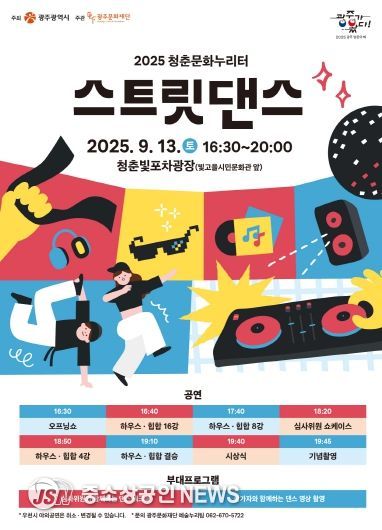 광주광역시와 광주문화재단(대표이사 노희용)은 청년 문화 활성화를 위해 '주말은 청춘 - 스트릿댄스' 행사를 오는 9월 13일 오후 4시 30분, 청춘빛포차광장에서 개최한다.