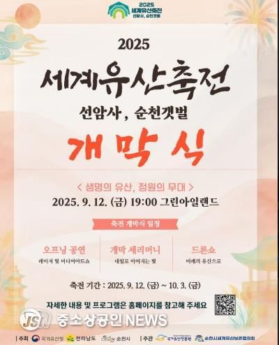 순천시와 순천시 세계유산보존협의회는 오는 12일 19시 그린아일랜드에서 '2025 세계유산축전 선암사, 순천갯벌' 개막식을 개최한다고 밝혔다.