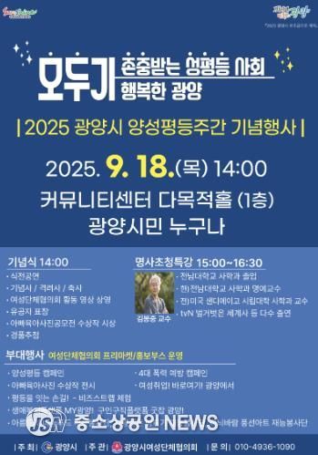 광양시는 오는 9월 18일 오후 2시, 커뮤니티센터 다목적홀에서 2025년 양성평등주간 기념행사를 개최한다고 밝혔다.