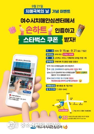 이번 이벤트는 치매극복주간에 여수시치매안심센터를 방문해 인증 사진을 남긴 참여자 중 선착순 200명에게 스타벅스 모바일 쿠폰을 증정하는 행사로, 지역 주민 누구나 참여할 수 있다.