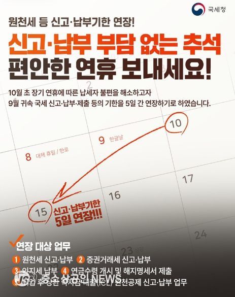 10월 초 장기 연휴에 따른 납세자 불편을 해소하고자 9월 귀속 국세 신고·납부·제출 등의 기한을 5일 간 연장하기로 하였습니다.