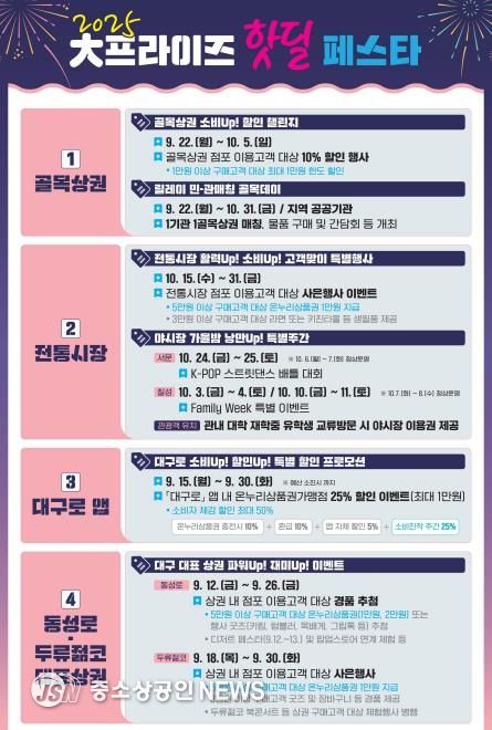 이 같은 소상공인 매출증대 효과를 이어가고 정부의 민생회복 정책의 승수효과를 극대화하기 위해, 대구시는 9월 15일부터 신규 편성예산 21억 원과 기존 가용예산 4억 원 등 총 25억 원 규모의 재원을 투입해 자체 대규모 소비촉진 행사인 ‘2025 大프라이즈 핫딜 Festa’를 개최한다.