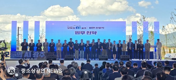 광주광역시는 11일 북구 첨단3지구 인공지능산업융합 집적단지에서 열린 ‘모두의 AI 광주 비전 선포식’에서 인공지능(AI) 및 반도체 분야 기관‧기업 21곳과 ‘광주형 인공지능 비즈니스 업무협약’을 체결했다.
