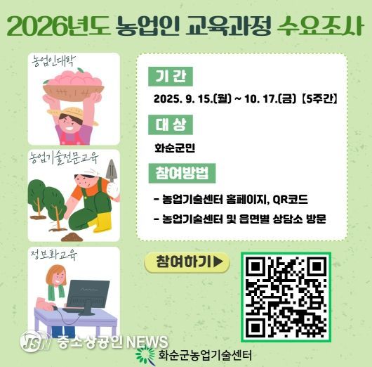 화순군은 2026년도 농업인 교육과정 운영에 앞서 실효성 높은 맞춤형 교육과정 편성을 위해 9월 15일부터 10월 17일까지 5주간 농업인을 대상으로 수요 조사를 진행한다고 밝혔다.