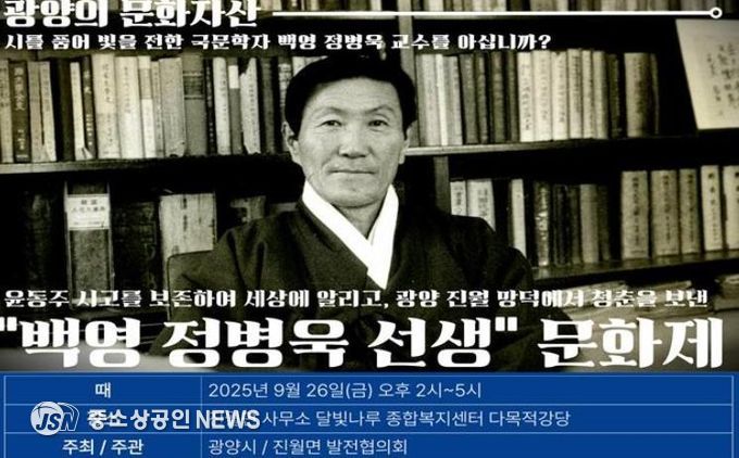 광양시는 진월면발전협의회가 오는 9월 26일 오후 2시 달빛나루 종합복지센터 다목적강당에서 ‘백영 정병욱 선생 문화제’를 개최한다고 밝혔다.