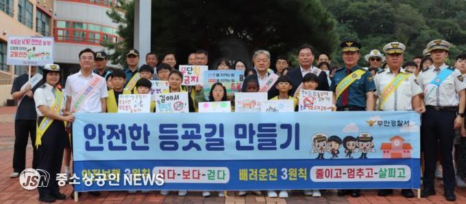 무안경찰서는 9월 17일 남악초등학교 앞에서 군청, 교육 지원청, 소방서, 모범운전자회, 남악초등학교 교사 등 유관기관과 협업하여 등굣길 어린이 약취유인 예방 및 교통안전 캠페인을 전개했다.