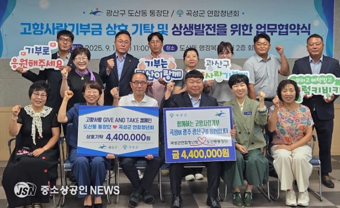광주 광산구 도산동 통장단(단장 박창곤)과 전남 곡성군 연합청년회(회장 오종국)가 지난 12일 도산동 행정복지센터 2층 회의실에서 고향사랑기부제 상호 협약을 체결했다.