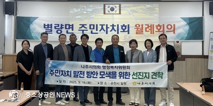 나주시의회 행정복지위원회(위원장 조영미)는 지난 16일 순천시 주암면 문성마을, 마을공동체지원센터, 변량면 주민자치회를 방문하여 주민자치회 운영 사례와 성과를 청취하고, 향후 나주시 주민자치 발전 방안을 모색하는 뜻깊은 시간을 가졌다고 17일 밝혔다.