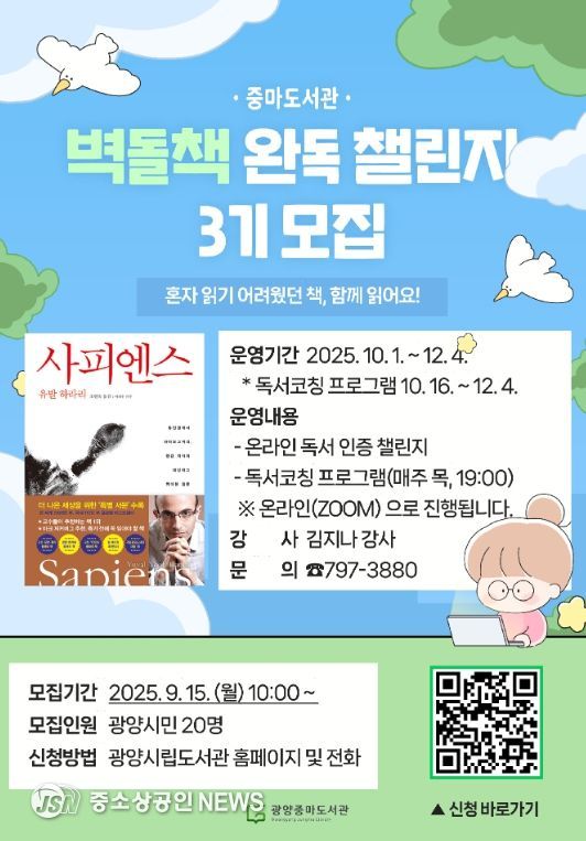광양중마도서관은 시민들의 깊이 있는 독서 습관 형성을 돕기 위해 오는 10월부터 ‘벽돌책 완독 챌린지’ 3기를 운영한다고 밝혔다.