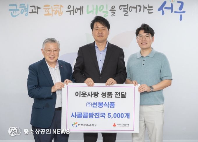 인천 서구는 지난 17일 오류동 소재 식품제조가공업체 ㈜선봉식품(대표 고종국)이 사골곰탕 5,000개(시가 1,400만 원 상당)를 기부했다고 18일 밝혔다.