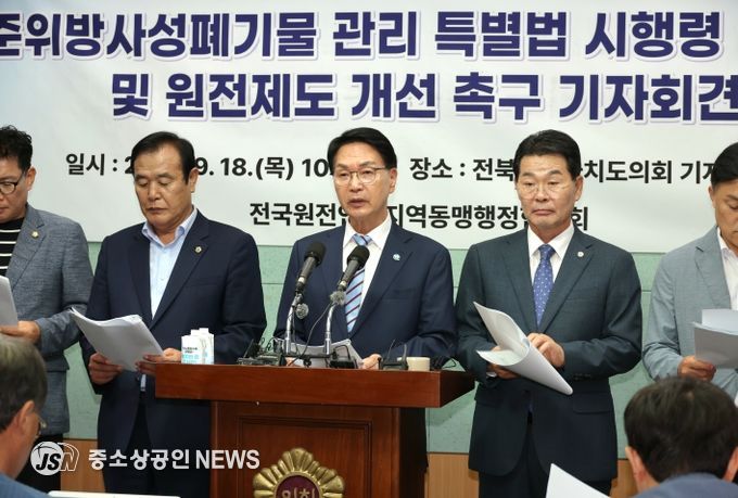 심덕섭 고창군수가 18일 오전 전북특별자치도 도의회 브리핑룸에서 열린 전국원전인근지역동맹 행정협의회 공동 기자회견에 참여해 “시행을 앞둔 고준위핵폐기물 임시저장시설 설치를 골자로 한 ‘특별법 시행령’에 깊은 유감을 표하며 원전과 관련된 불합리한 법령 및 제도를 개선할 것”을 촉구했다.