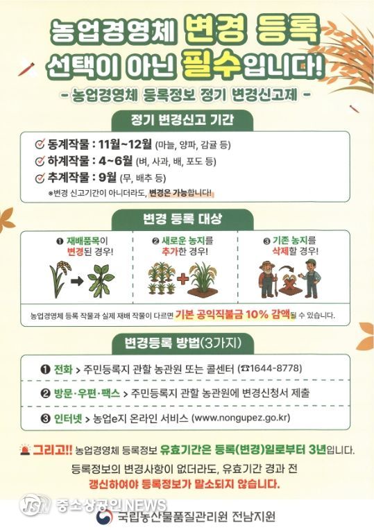 그러나 올해까지는 정기변경 신고 계도기간으로 운영하고 내년부터는 직불금 등이 감액될 수 있으므로 농업경영체 등록정보의 변경등록이 필수적이다.