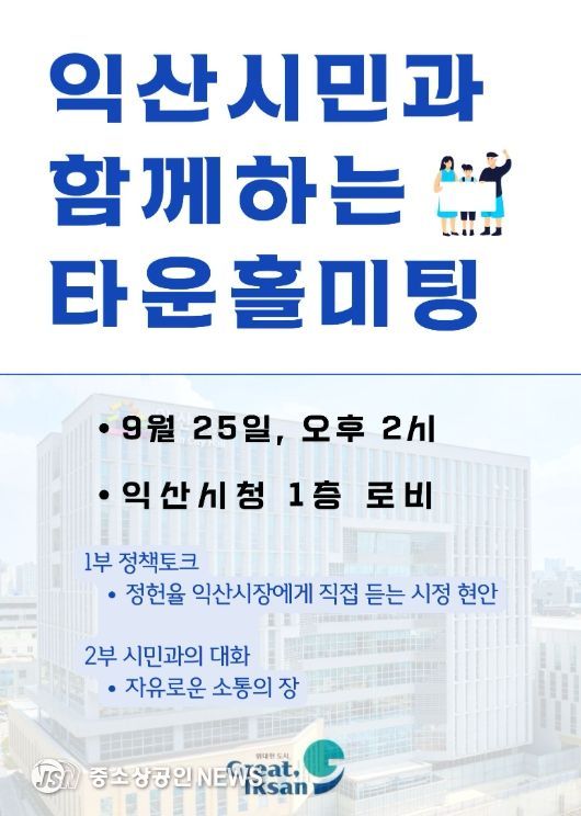익산시는 오는 25일 오후 2시 시청 1층 로비에서 '시민과 함께하는 타운홀미팅'을 개최한다고 19일 밝혔다.