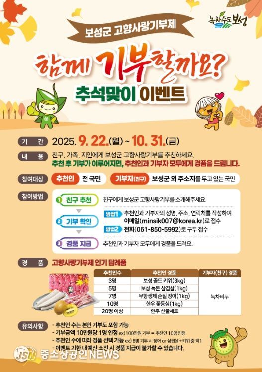 보성군은 다가오는 추석을 맞아 고향사랑기부제 활성화를 위해 ‘함께 기부할까요? 추석맞이 이벤트’를 오는 9월 22일부터 10월 31일까지 진행한다고 밝혔다.
