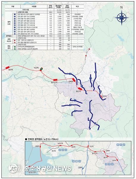 이번 사업 계획에는 △전주 중심 방사형 광역도로망 10개 노선(신설 5개, 확장 5개, 총연장 69㎞) △전주~새만금을 잇는 광역철도(76㎞, 9개 정차역) △버스·화물 공영차고지 2곳 △환승센터 2곳 조성 등 15개 핵심사업이 담겼다.