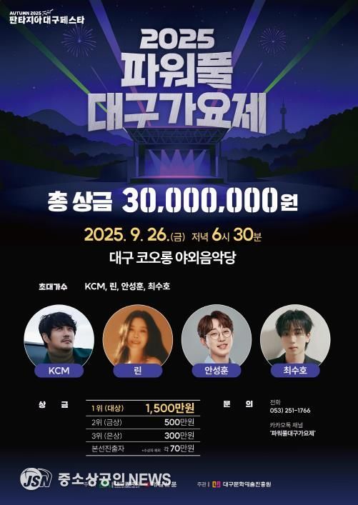 대구광역시는 오는 9월 26일 오후 6시 30분, 코오롱 야외음악당에서 전국의 재능 있는 음악인들에게 무대의 기회를 제공하고, 시민과 함께하는 가요경연 축제인 ‘2025 파워풀 대구가요제’를 개최한다.